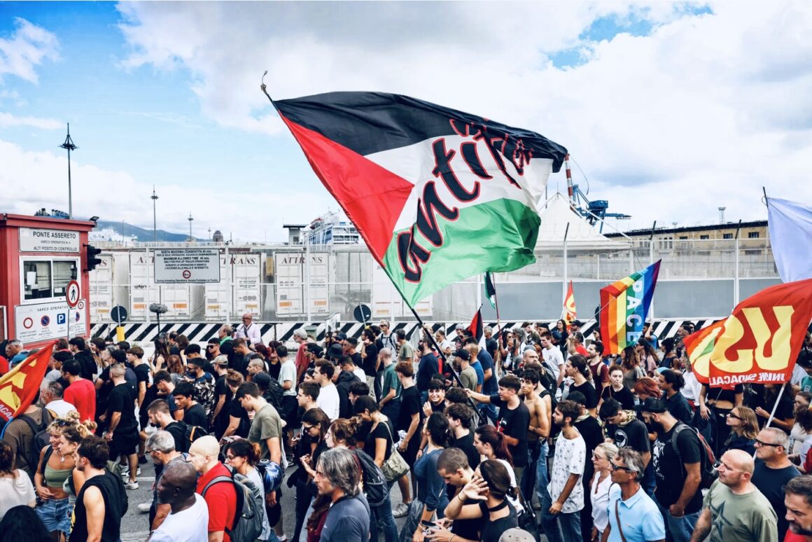 Above: protesters blocking an Italian port to prevent shipments to the Zionist occupier.