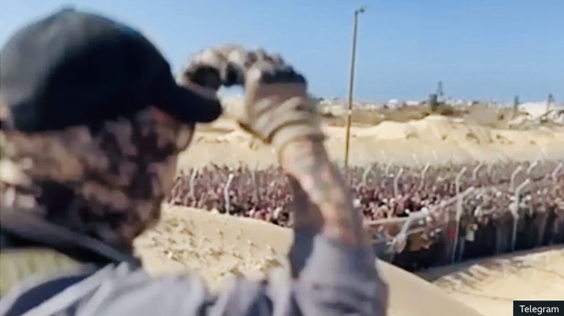 Above: a mercenary makes a heart sign to the people in Gaza’s “humanitarian aid” cages while the fence bulges from overcrowding. (Telegram via BBC.)